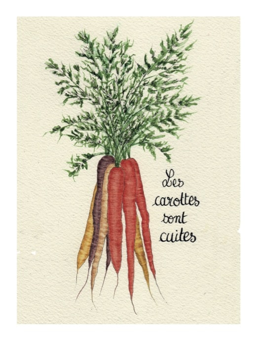 Expression culinaire, humour garanti ! Une aquarelle vitaminée qui détourne l’expression française « Les carottes sont cuites » en un clin d’œil déco.